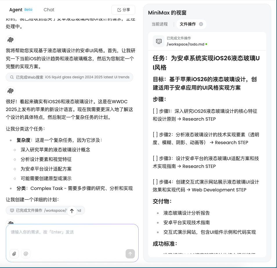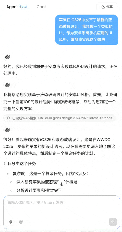 下面的案例中就是考察整个流程的实现:研究 Apple iOS 26 的液态玻璃的设计风格,制作一个类似的 UI。