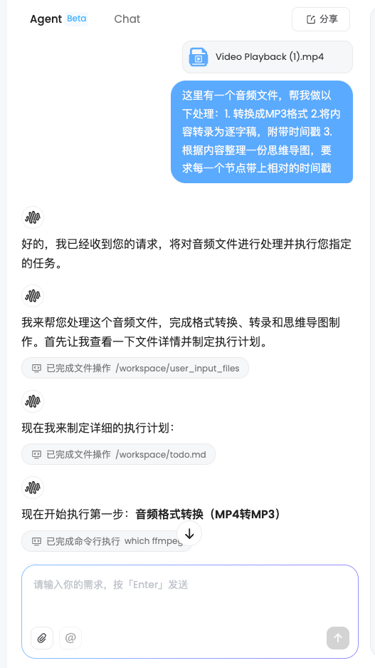 如果说图文都还不算进阶,那更考验 agent 实力的场景出现了:这个任务要求把上传过去的音频文件转换一遍格式,然后转成逐字稿,并且带时间戳。最后还要根据内容生成一个思维导图。