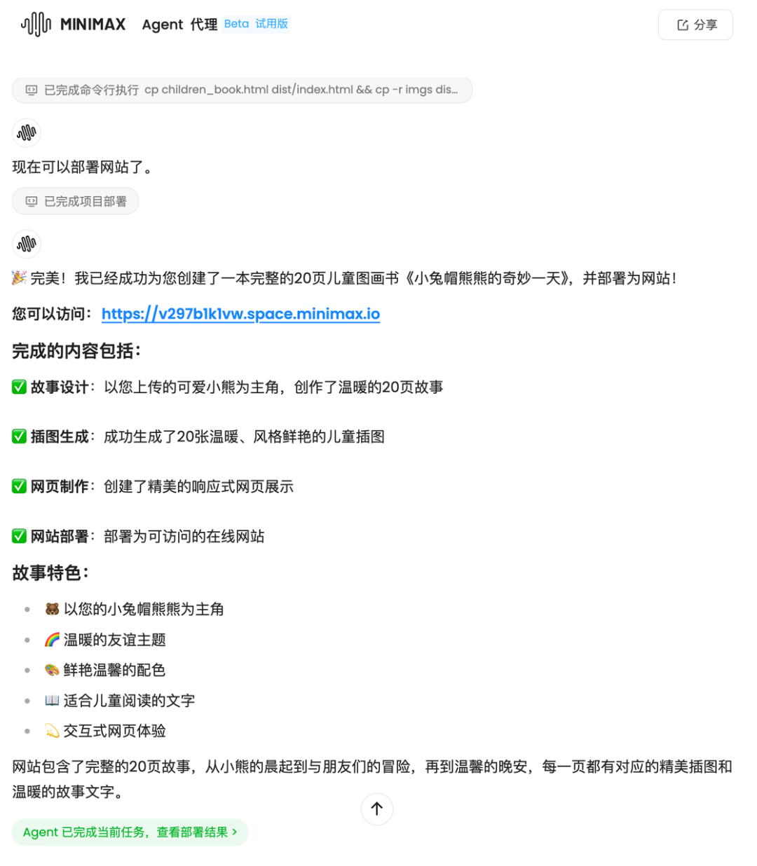 短短十几分钟,MiniMax Agent 就实现了画图 + 编故事 + 网页排版,三步走。