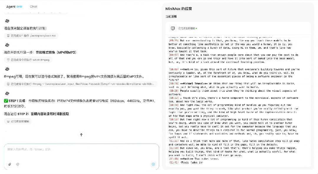 MiniMax Agent 在整个流程中展现出的高效与便捷非常值得一赞。最直观的感受便是格式转换的无缝衔接。从进程视窗里可以看到,MiniMax Agent 在生成逐字稿方面的快速、准确。