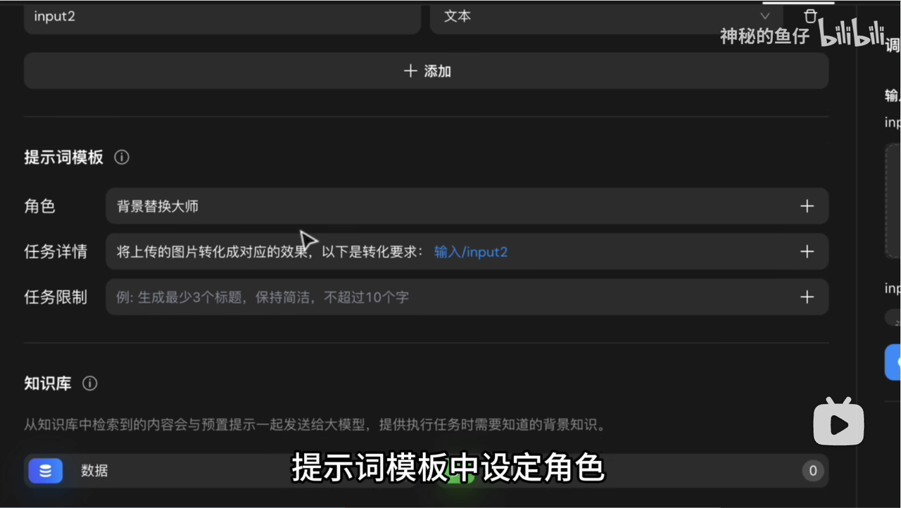 在提示词模板中设定好角色和任务说明,把输入字段整合进任务描述,然后选择模型。