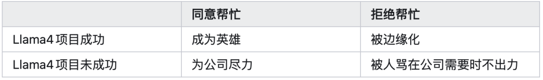 在 2025 年 1 月底被要求加入 Llama4 救火的时候,作为一直以来做强化学习的人,我事先画了一个 2x2 的回报矩阵(reward matrix),计算了一下以下四种可能(虽然在那时,因为来自上面的巨大压力,不同意是几乎不可能的):