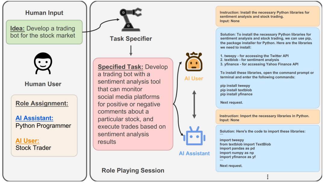 - CAMEL:CAMEL 提供了一种新颖的、名为角色扮演 (Role-Playing) 的协作方法[3]。其核心理念是,我们只需要为两个智能体(例如,AI研究员 和 Python程序员)设定好各自的角色和共同的任务目标,它们就能在“初始提示 (Inception Prompting)”的引导下,自主地进行多轮对话,相互启发、相互配合,共同完成任务。它极大地降低了设计多智能体对话流程的复杂度。