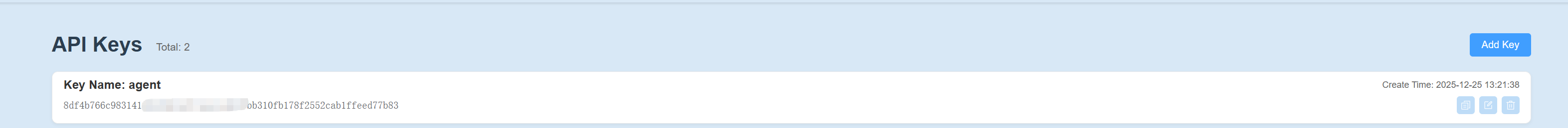 API Keys页面创建新密钥。这是你通往平台上所有MCP服务的唯一凭证,请妥善保存。