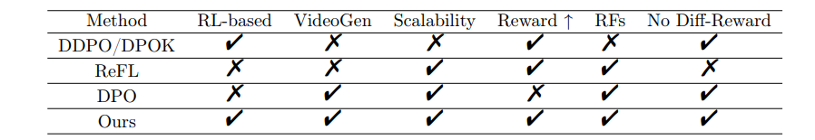 基于强化学习的方法将奖励作为黑盒目标进行优化,提供了潜在的解决方案,但也引入了三个未解决的挑战:(1)整流流模型基于常微分方程的采样与马尔可夫决策过程的形式化存在冲突;(2)先前的策略梯度方法在小规模数据集之外的扩展中表现出不稳定性;(3)现有方法在视频生成任务上尚未得到验证。
