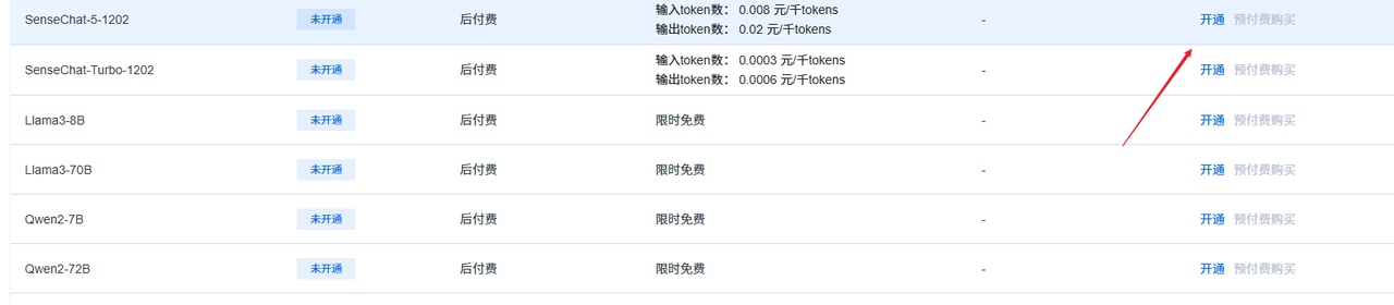 前往服务列表开通模型,我这里使用商汤日日新的SenseChat-5-1202语言模型