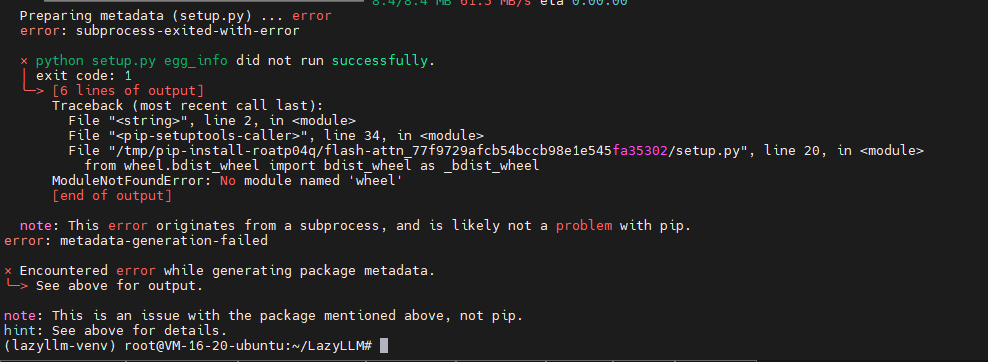 这里遇到一个小问题:pip报告缺少wheel包。falsh-attn包在安装过程中需要wheel来构建wheel包。