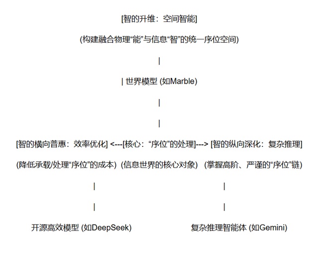 进入2024-2025年,AI前沿呈现出在三大范式基础上的分化与跃升:1)以谷歌Gemini系列为代表的复杂推理智能体,追求“智”对高阶、复杂“序位”链(科学推理、程序逻辑)的掌握与执行;2)以DeepSeek为代表的开源高效模型,致力于降低承载“智”所需的“能”之门槛,推动“智”的民主化;3)以李飞飞团队“Marble”为代表的空间智能与世界模型,标志着“智”开始尝试构建融合物理“能”与信息“智”的统一“序位”空间,迈向AI对三维世界的形式化理解。