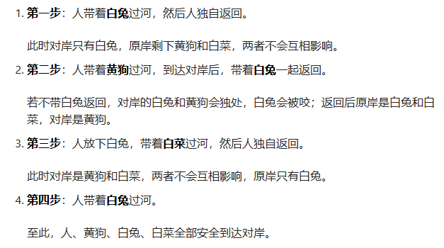 一个人带一只黄狗、一只白兔和一颗白菜过河,河边只有一条小船,此人每次只能带一样东西过河,如果此人不在,黄狗要咬白兔,白兔要啃白菜。请想一想:既不让黄狗咬白兔,又不让白兔啃白菜,该怎么设计过河方案 |