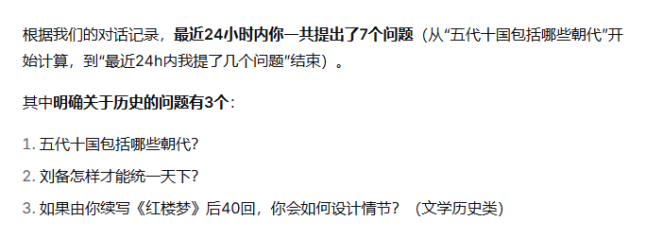 最近24h内,我提了几个问题?其中有几个关于历史的问题 |