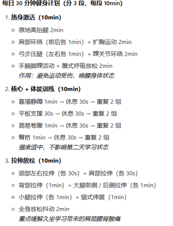 我是一名女学生,身高160cm,体重60kg,平时学习比较紧张,假如你是我的健身教练,请帮忙设计一个每天30min的健身计划 |