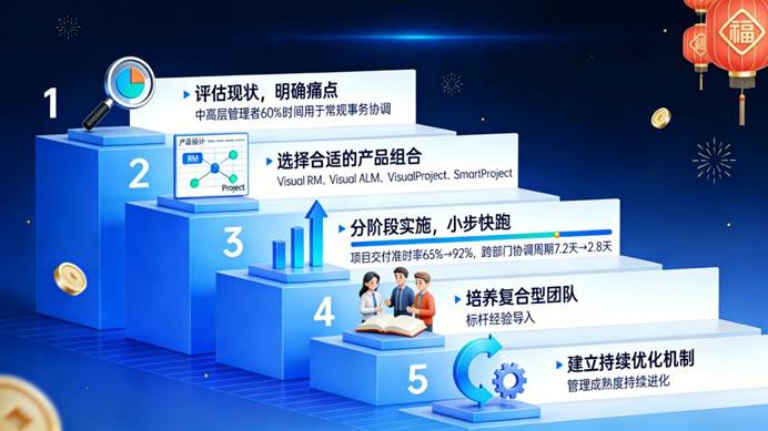 第一步:评估现状,明确痛点。新年伊始,正是盘点过去一年项目管理症结的最佳时机。一家股份制银行通过盘点发现,中高层管理者60%的时间用于常规事务协调。这种具体的痛点识别,为后续的转型提供了明确方向。