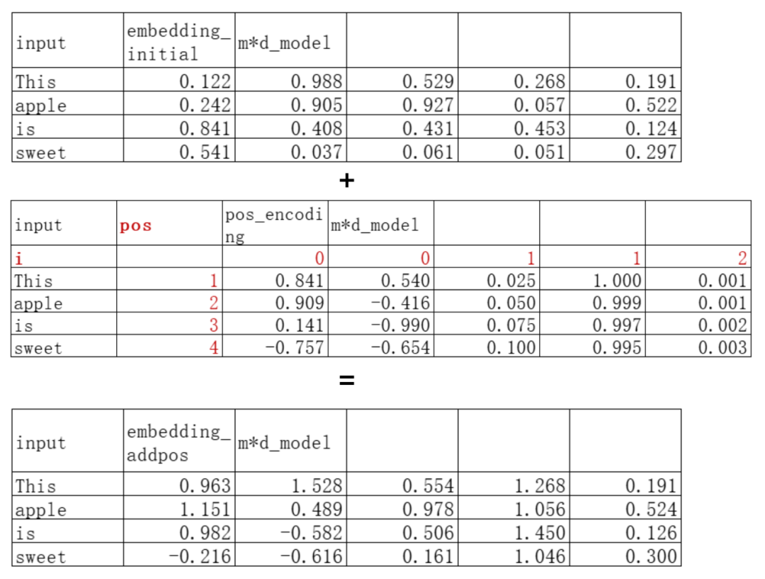 还是接着刚才“This apple is sweet”的例子,我们已经使用位置编码调整了token的embedding向量,得到了:
