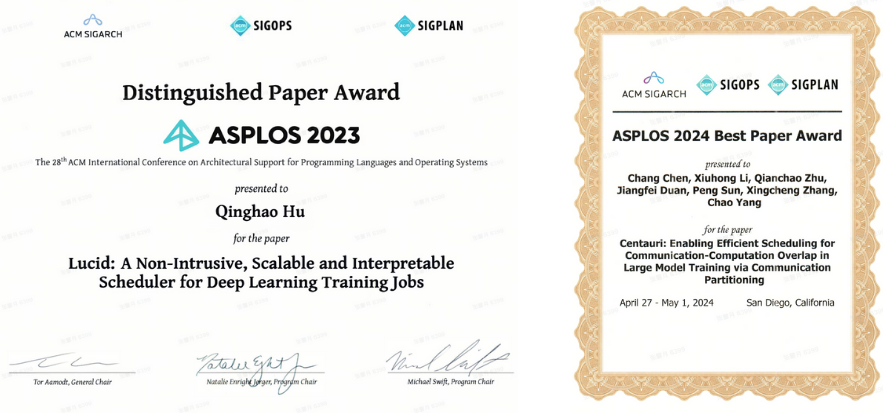 围绕深度学习作业调度、大模型训练中通信与计算融合等关键问题,DeepLink 团队发布了两篇核心论文,系统研究自研模型架构与硬件特性的深度协同,并于 2023 年和 2024 年连续两年在国际顶级会议 ASPLOS 上分别获得杰出论文奖与最佳论文奖,提出了面向实际算力环境的高效训练策略。这是国内机构近十年来首次在 ASPLOS 获得此类奖项,也体现了相关技术路径的系统价值。
