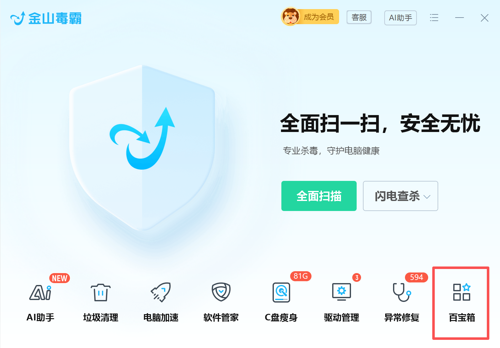 点击链接下载安装金山毒霸:https://www.ijinshan.com/functions/pcdoctor.html。 安装完成后,在百宝箱找到并点击【电脑医生】