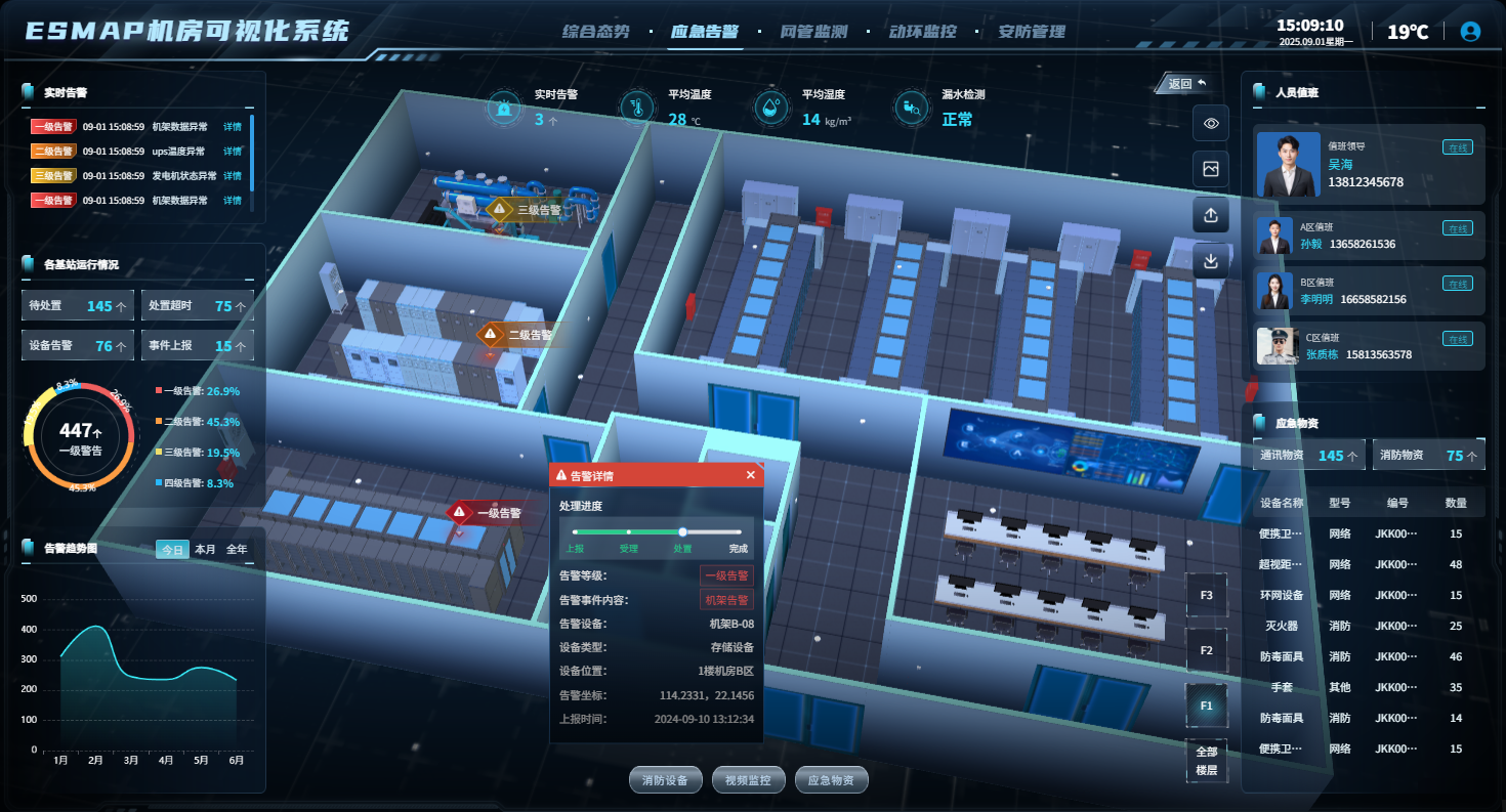 - 应急响应:对接应急管理模块,针对火灾、断电等突发情况自动生成应急处置预案,指导运维人员快速开展救援,降低事故损失。