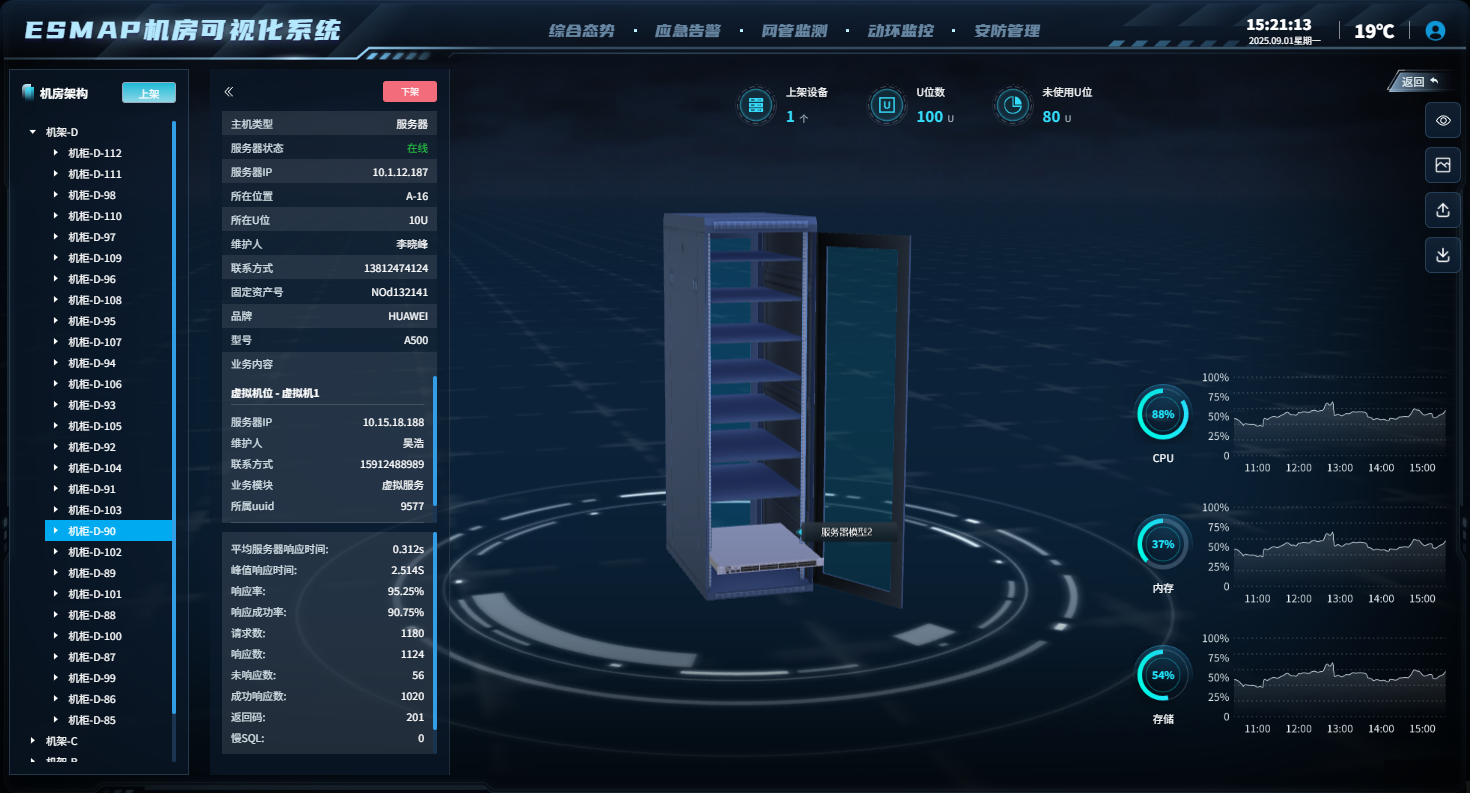 - 设备状态:实时呈现服务器(在线率达 99% 以上)、交换机、空调、UPS 等设备的运行参数,如 UPS 三相输出负载百分比、输入相电压等关键指标;