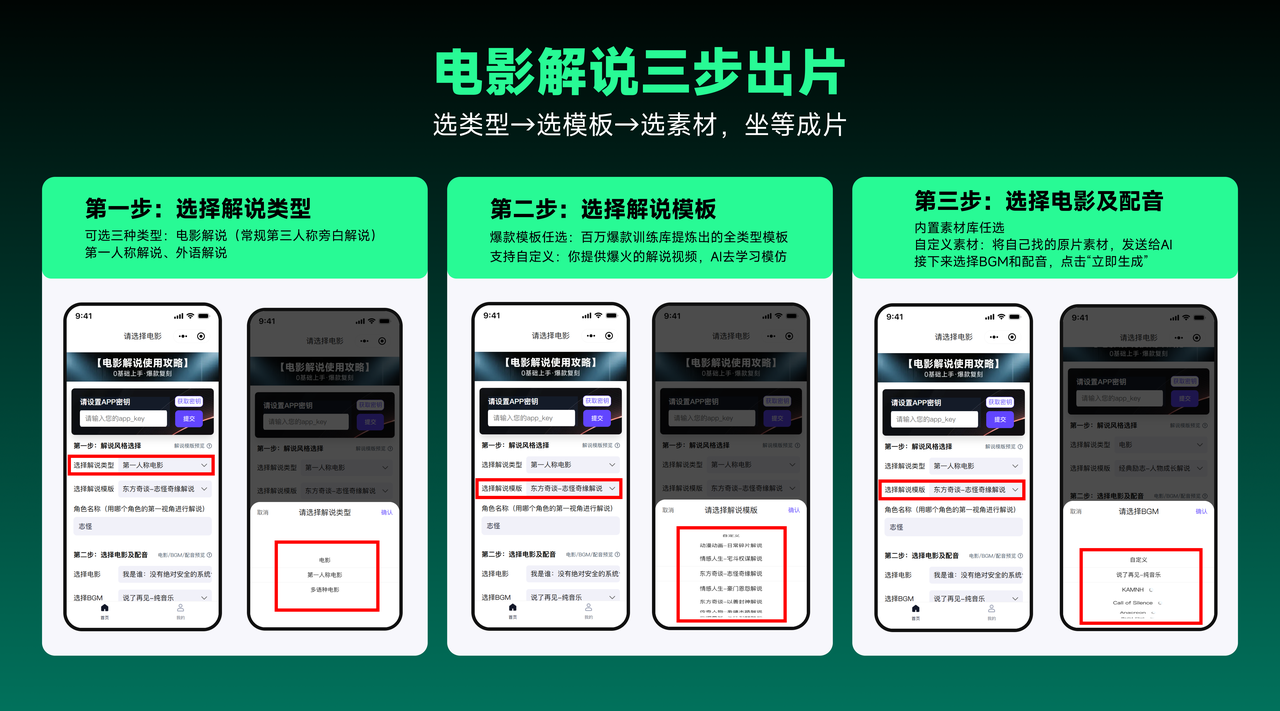 在AI电影解说智能体的实际使用流程中,创作者只需要完成几步操作:真正做到三步成片。