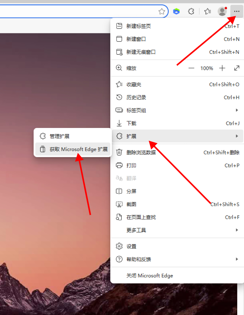打开 Edge 浏览器,点击右上角的三个点 -> 【扩展】 -> 【管理扩展】 -> 【获取 Microsoft Edge 扩展】。