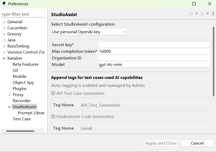 - 默认情况下,当使用 Katalon 服务时,系统会调用 GPT-4.1 mini 模型。