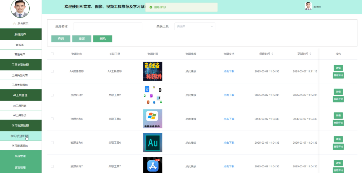 学习资源管理:管理和优化平台上的学习资源,确保内容的质量和相关性满足用户需求。管理员能够添加新的学习资源,更新已有资源的内容,以及删除过时的资料,促进知识的持续更新。