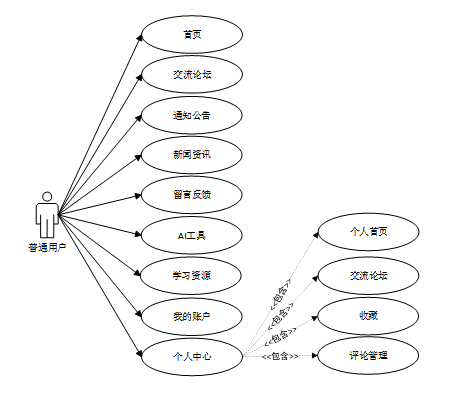 普通用户主要利用平台获取AI工具推荐、学习资源以及参与社区交流。他们通过浏览首页获取最新资讯和推荐内容,使用AI工具处理文本、图像或视频任务,并通过学习资源模块提升个人技能。此外,用户可以在交流论坛中分享经验、提出问题并参与讨论。对于感兴趣的工具或资源,用户可以进行点赞、收藏及评论,以个性化的方式管理和追踪自己的学习进度和偏好。普通用户角色用例图如下所示。