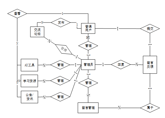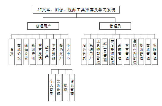 本研究采用Spring Boot作为后端框架,结合Java编程语言和MySQL数据库,构建了一个稳定、高效的系统架构。平台面向两类主要用户:普通用户和管理员。普通用户可以访问首页、交流论坛、通知公告、新闻资讯等板块,获取最新的AI技术和行业发展动态;同时,他们还能利用平台提供的AI工具进行文本、图像、视频的智能处理,并通过学习资源模块提升自己的技术水平。