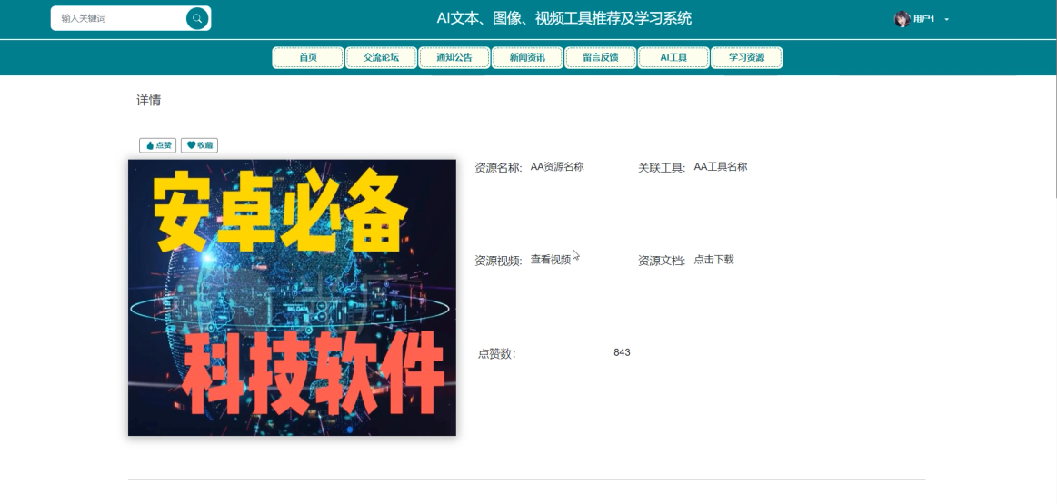 AI工具:展示多种类型的AI工具,包括文本、图像、视频处理等,满足不同需求。用户可以对感兴趣的工具进行点赞、收藏,并在实际项目中应用。