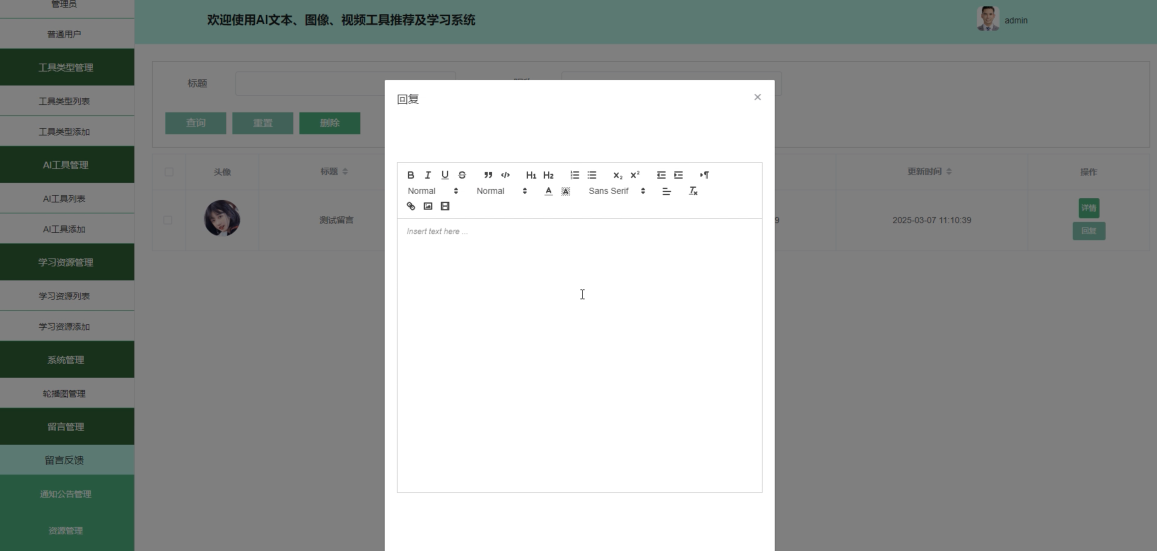 留言反馈:允许用户提交意见和建议,提升系统的用户体验。管理员能够及时回复用户的留言,建立良好的沟通机制。