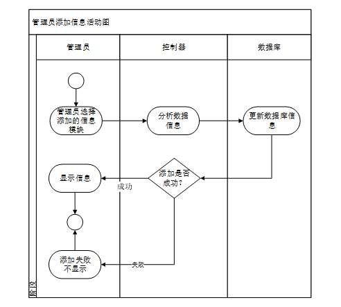 此活动图描述了管理员添加信息。管理员可以通过信息管理模块页面选择要添加的基本信息。添加成功传入数据库中,失败则不添加。管理员可以保存信息并更新系统中的信息。管理员添加信息功能的活动图如图3-4所示。