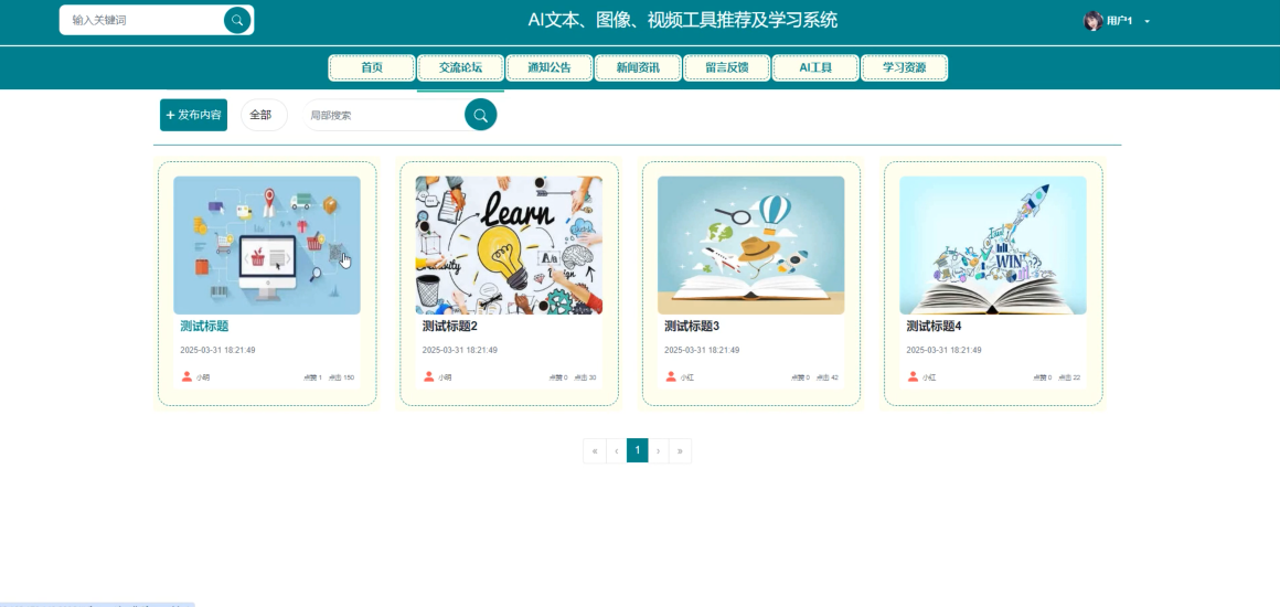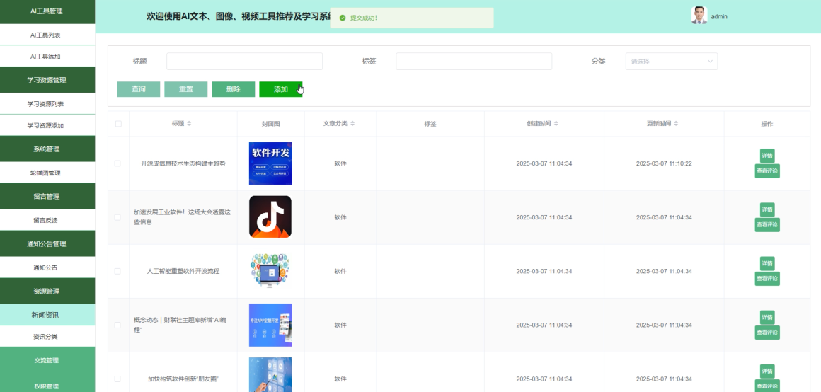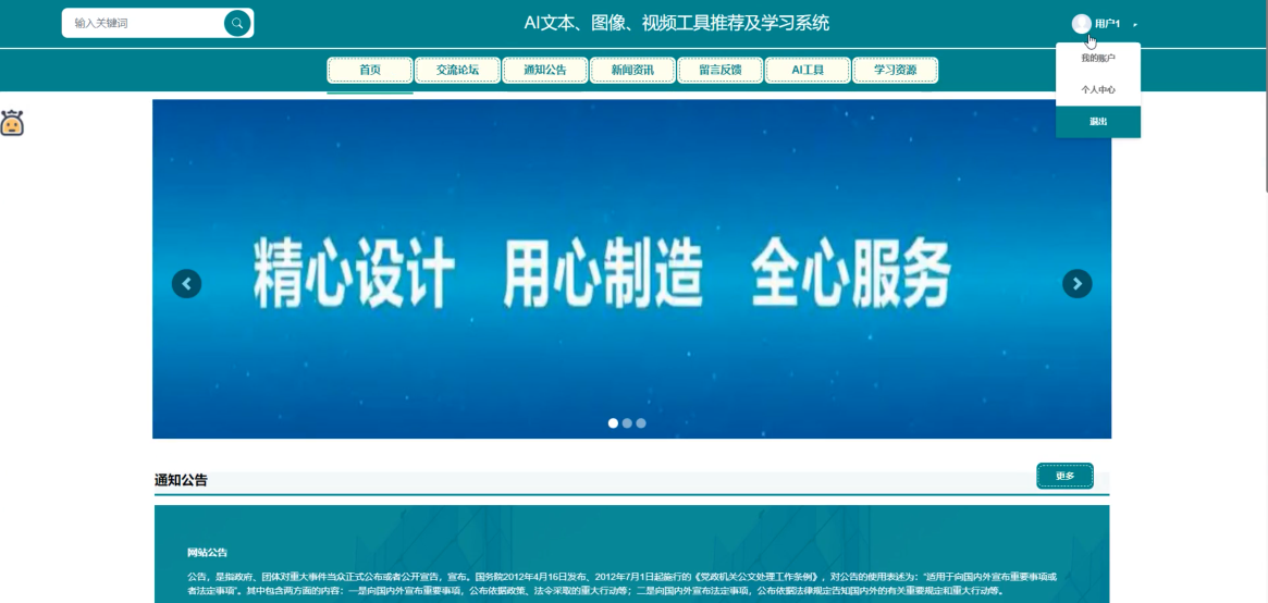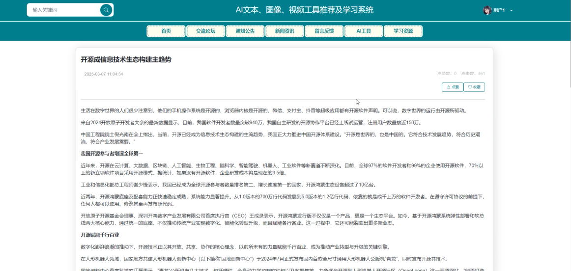 本文开发了一个基于SpringBoot框架的AI文本、图像、视频工具推荐及学习系统。系统采用Java语言和MySQL数据库,构建了稳定高效的系统架构,主要面向普通用户和管理员两类角色。普通用户可访问首页、交流论坛、通知公告、新闻资讯等板块,获取AI技术动态;还可使用平台提供的AI工具进行智能处理,并通过学习资源模块提升技术水平。管理员则负责系统内容管理和用户管理。系统测试结果表明各项功能运行良好,