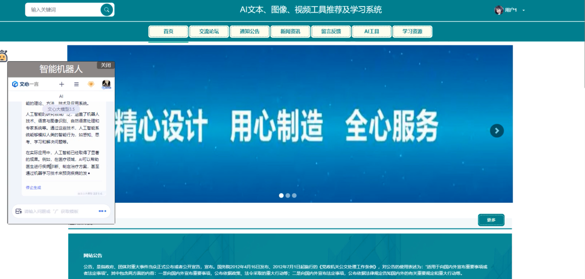 随着信息技术的快速发展,人工智能(AI)技术逐渐渗透到各行各业,为传统行业带来了深刻的变革。尤其是在文本处理、图像识别和视频分析等领域,AI工具的应用不仅提升了工作效率,还开创了新的商业模式和服务形态。因此本研究旨在开发一个集成AI文本、图像、视频处理功能,并提供丰富的学习资源的综合平台。
