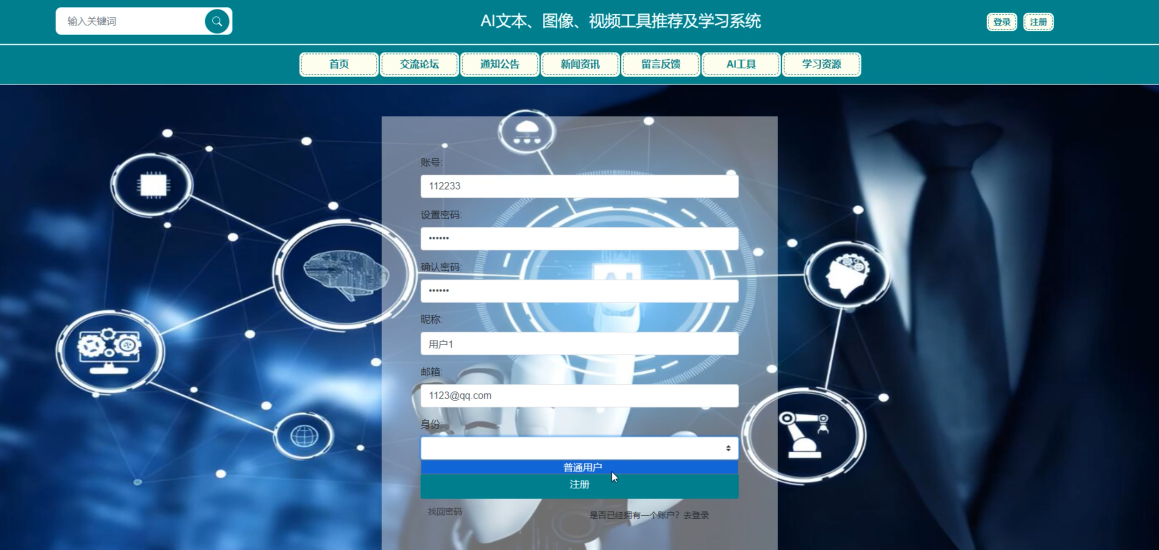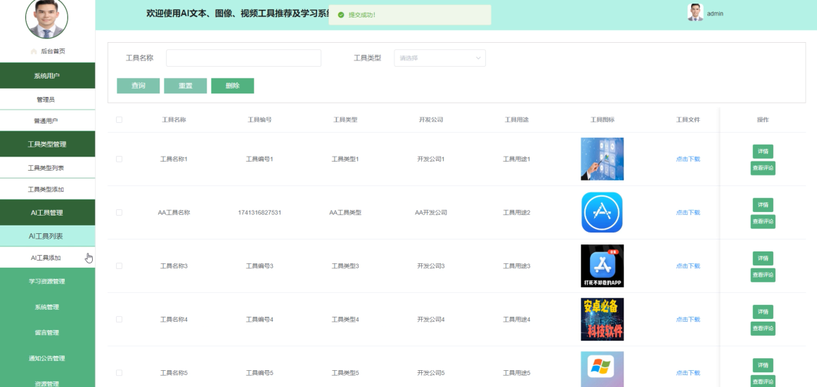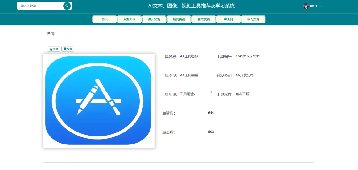 Key words: Spring Boot framework; AI text, image, video tool recommendation and learning system; Java language; MySQL