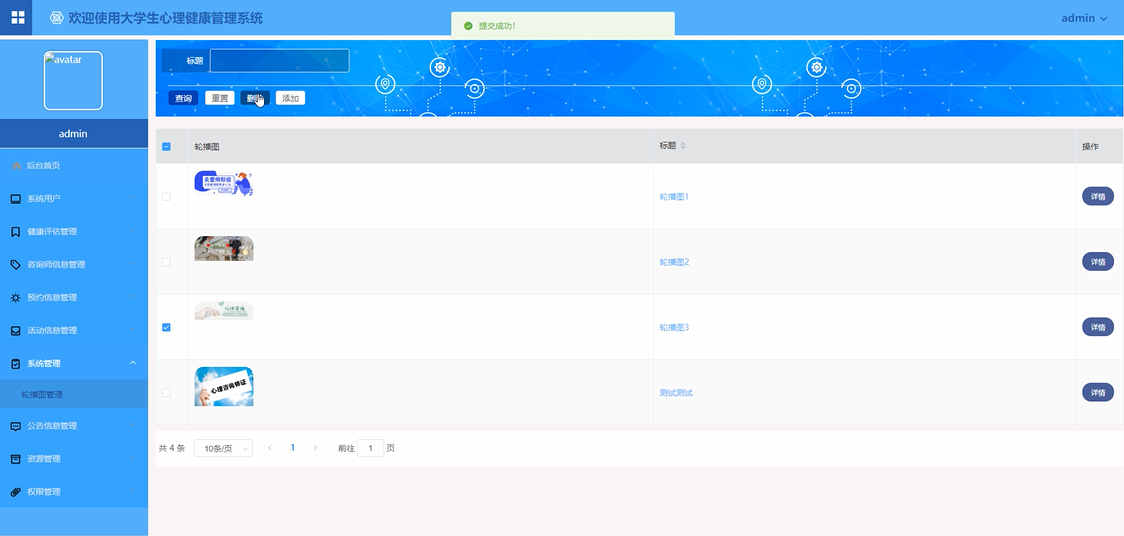 管理员点击“系统管理”这一菜单会显示轮播图这一个子菜单,管理员可以对前台展示的轮播图进行设置,界面如下图4-13所示。