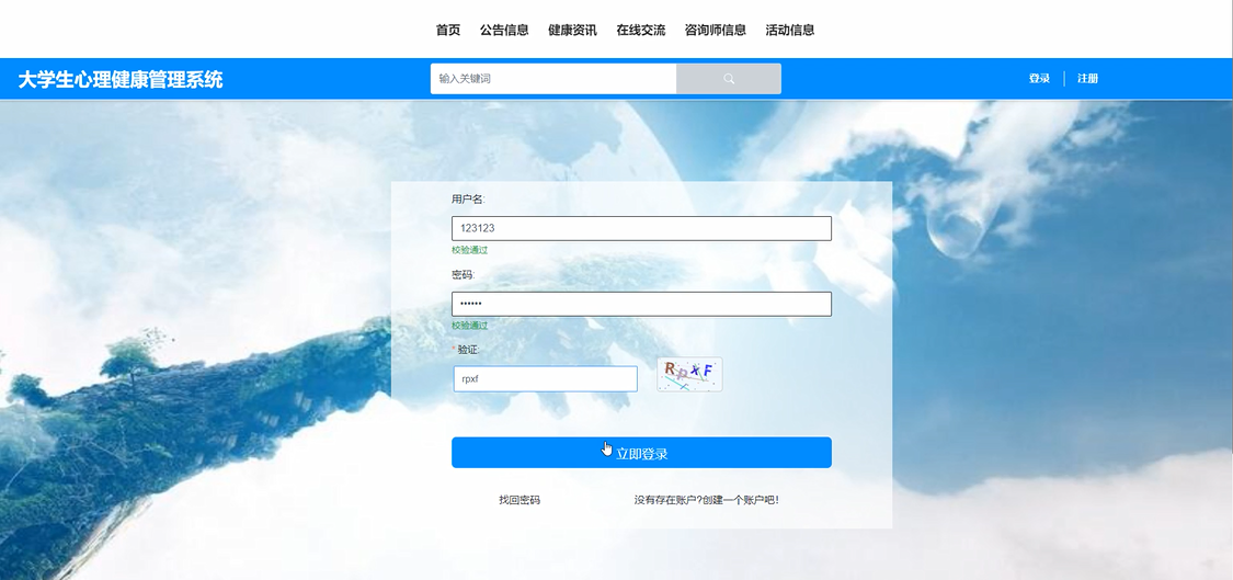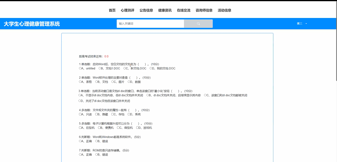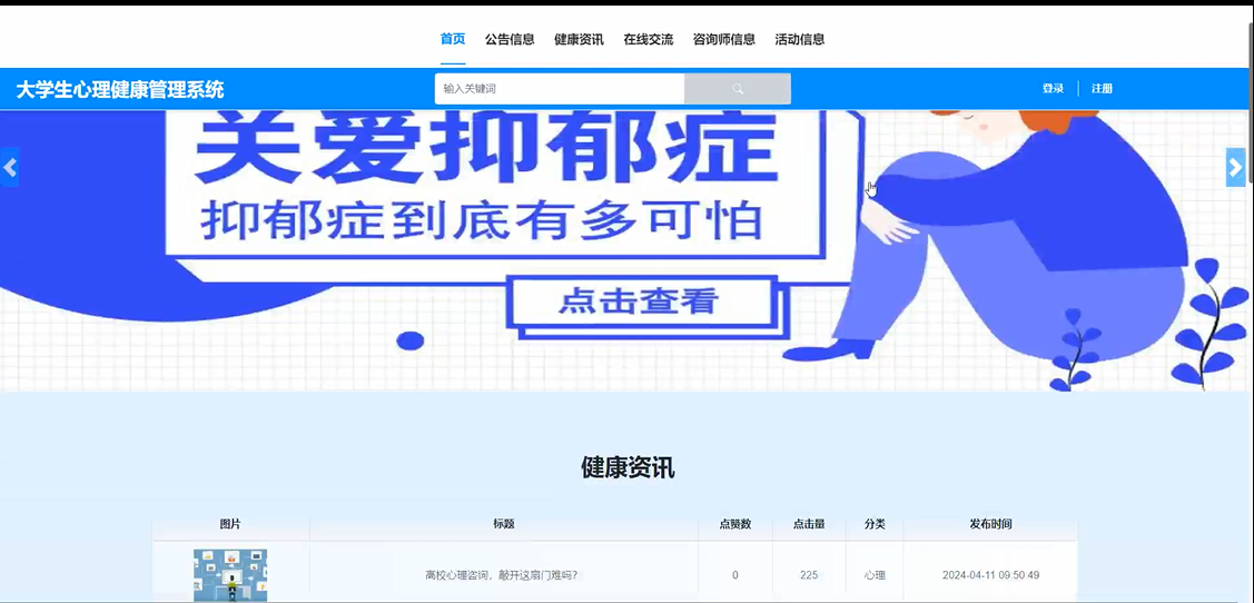 首页:提供个性化的首页展示,包括心理健康资讯、活动推荐、健康小贴士等,方便学生快速了解心理健康相关信息。