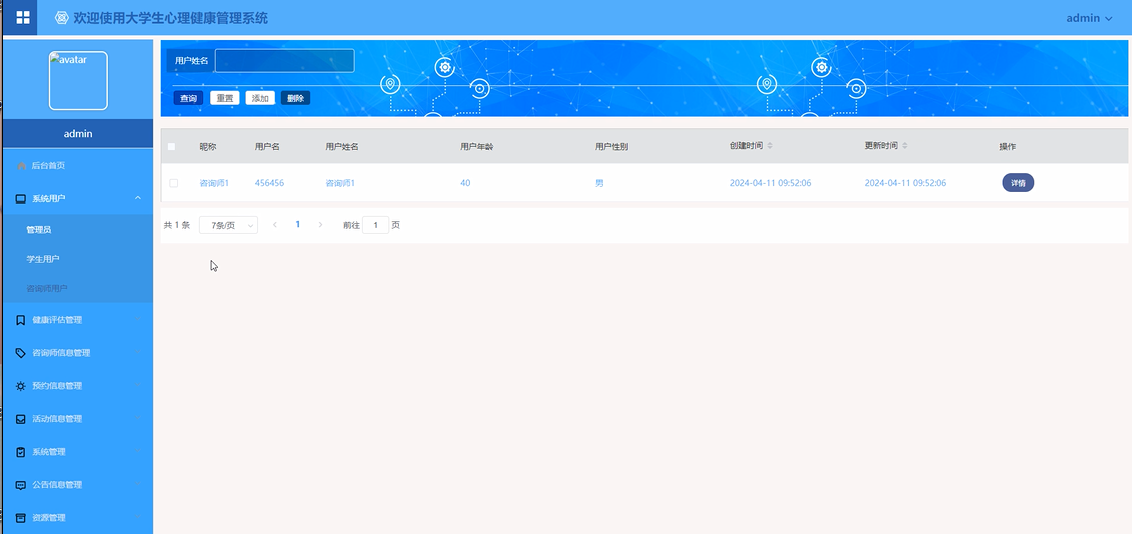 基于Springboot的大学生心理健康管理系统中的管理人员是可以对注册的学生用户、咨询师用户进行管理的,也可以对管理员进行管控。界面如下图4-12所示。