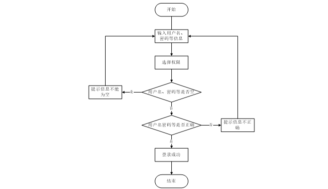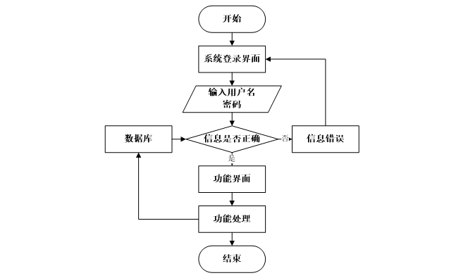 用户打开并进入系统后,会先显示登录界面,输入正确的用户名和密码,系统自动检测信息,若信息无误,则用户会进入系统功能界面,进行操作,否则会提示错误无法登录,操作流程如图2-3所示。
