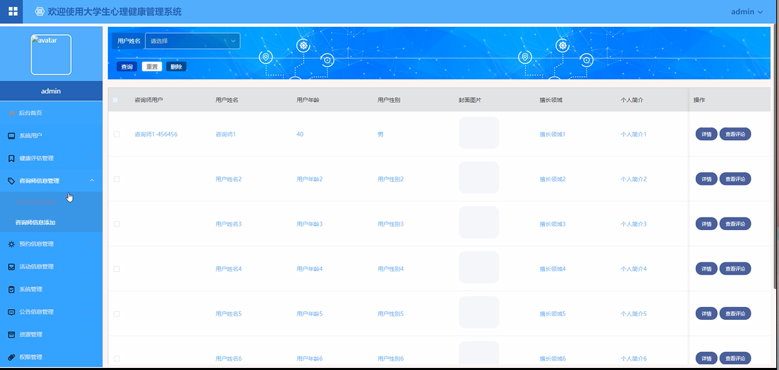 咨询师信息:展示咨询师的基本信息、专业领域、服务时间等,方便学生用户选择合适的咨询师进行咨询。