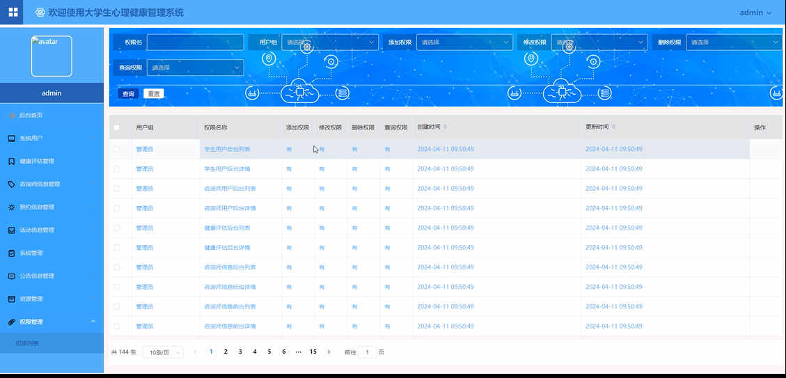 管理员点击“权限管理”这个菜单,可以设置和管理不同用户角色的权限,确保系统的安全性和稳定性。权限管理界面如下图所示。