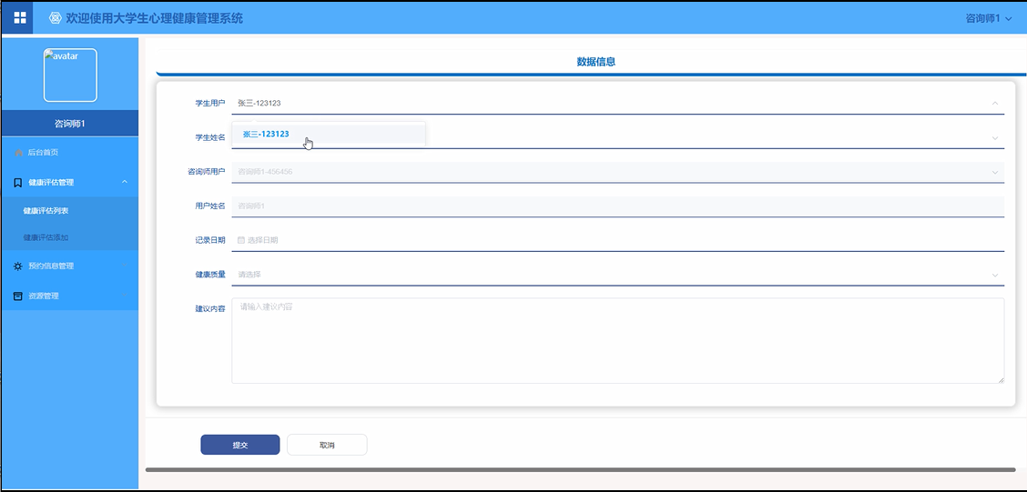 健康评估管理:咨询师应能够查看和管理学生的心理健康评估结果,提供针对性的咨询建议。
