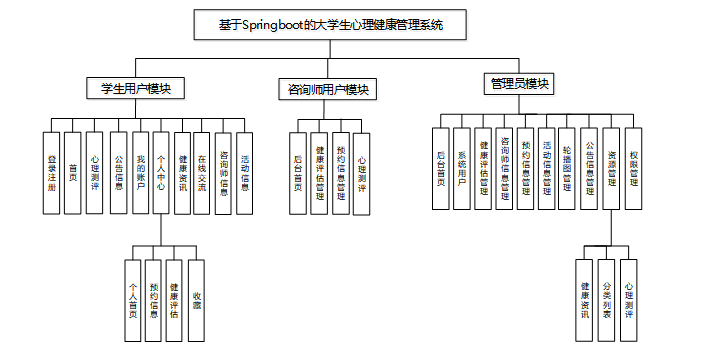 按照基于Springboot的大学生心理健康管理系统的角色,系统划分为了学生用户模块、咨询师用户模块和管理员模块这两大部分。