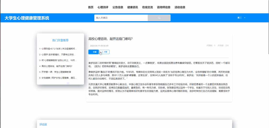 健康资讯:提供心理健康相关的文章、视频等资讯内容,供学生用户学习了解。