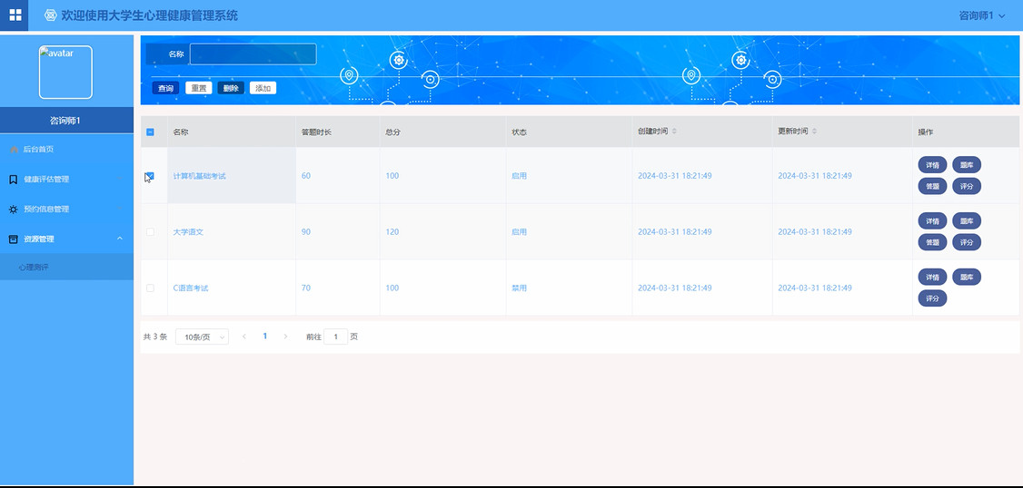 心理测评:咨询师通过系统生成心理测评试卷、题库,设置答题规则、进行试卷评分等,对学生进行专业的心理健康评估。