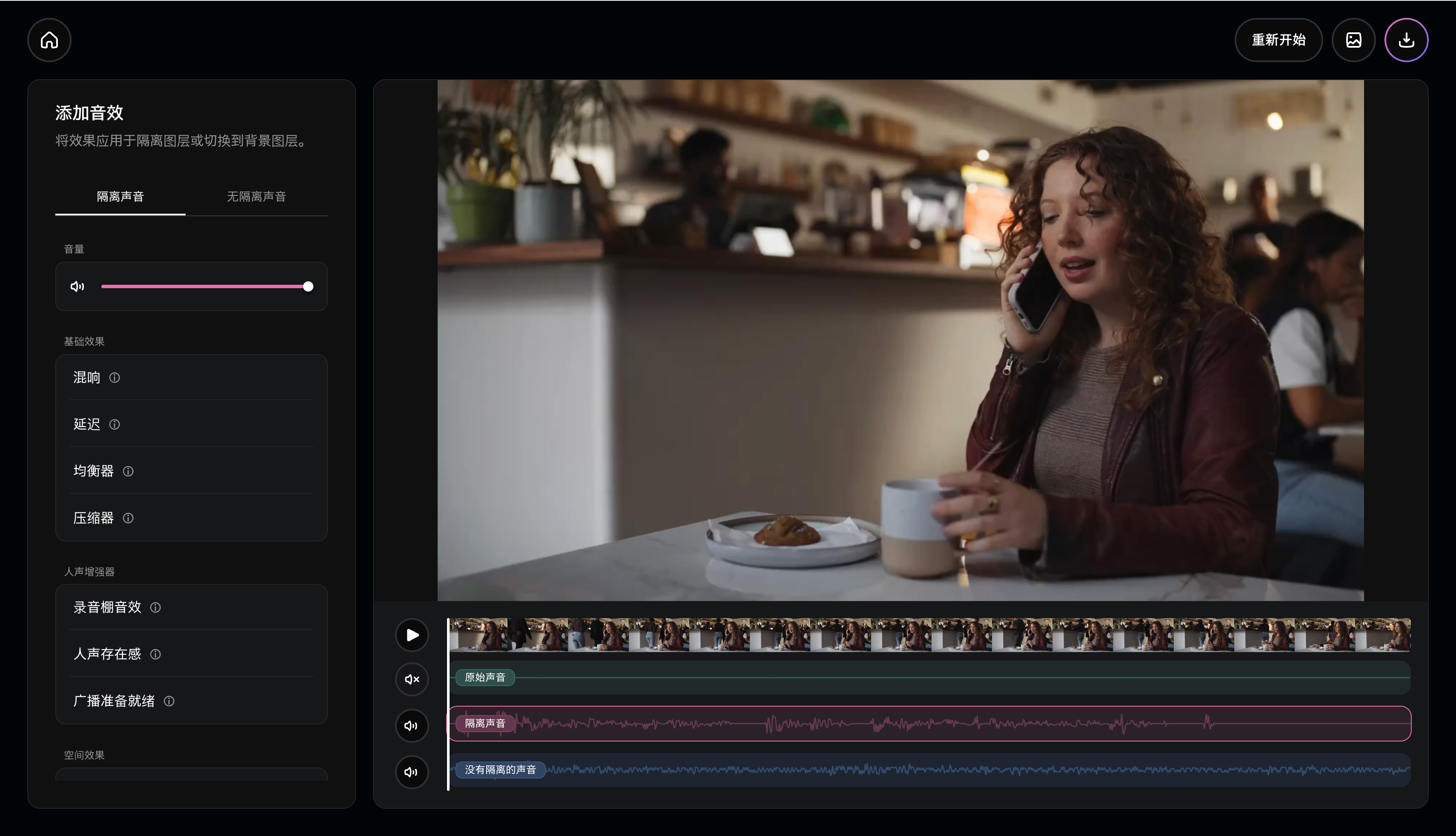 后期处理:电影对白降噪,去除背景里的狗叫声。