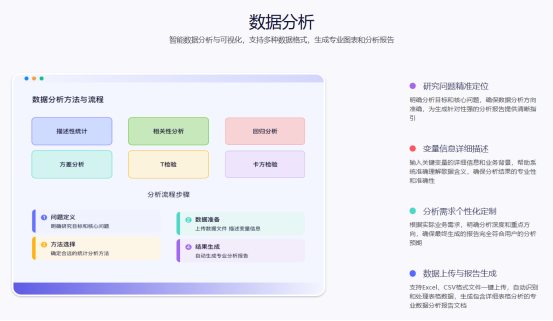 平台支持Excel、CSV等格式文件的一键上传,系统会自动识别数据结构并生成包含详细表格分析的专业数据分析报告文档 。更值得一提的是,系统不仅能生成分析结果,还会自动解释结果的学术含义,并提供规范的表达方式 。