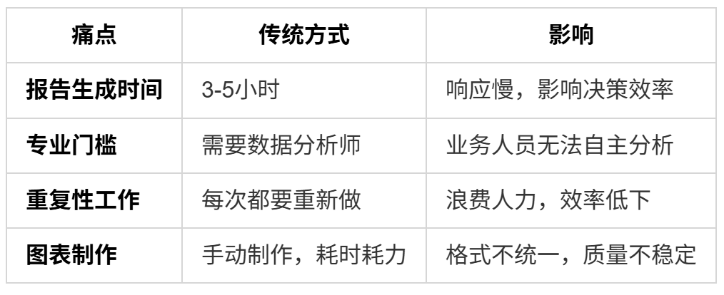 - 💰 人力成本高:需要专业数据分析师,业务人员无法自主分析