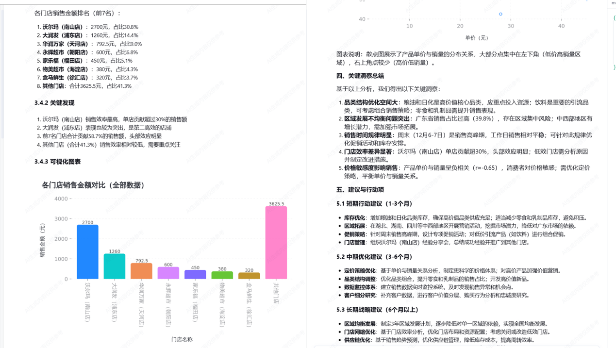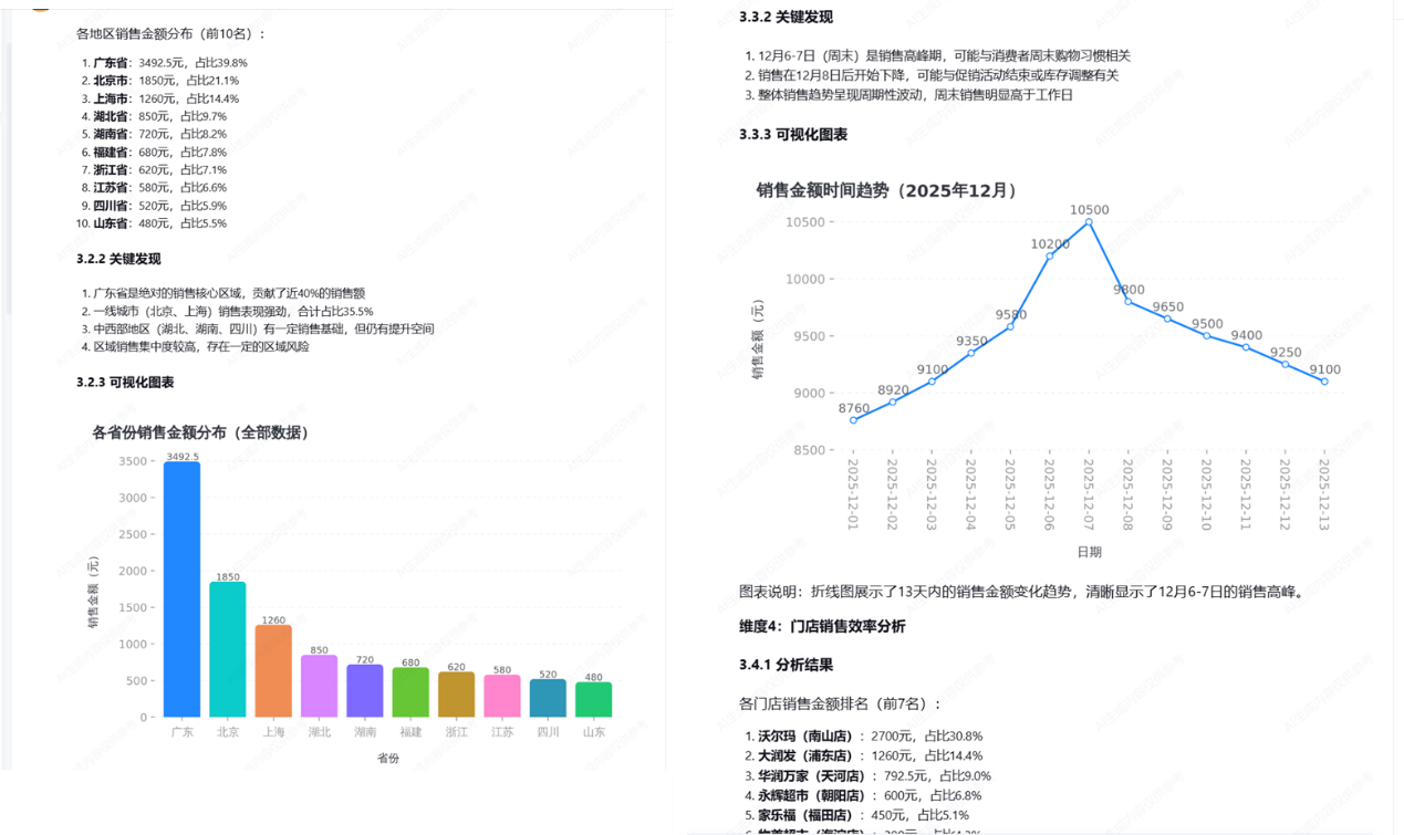 - 分析维度:自动识别品类、地区、时间、门店等维度