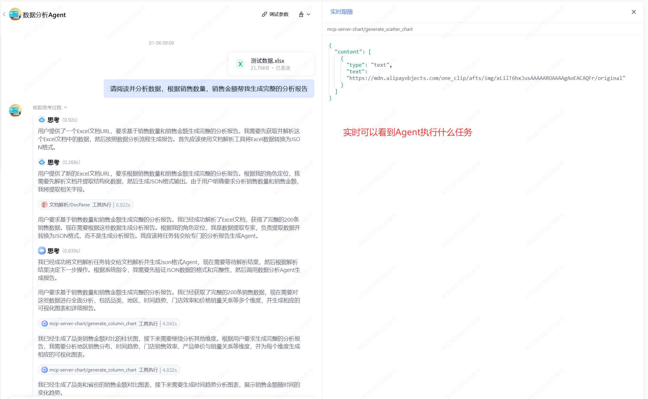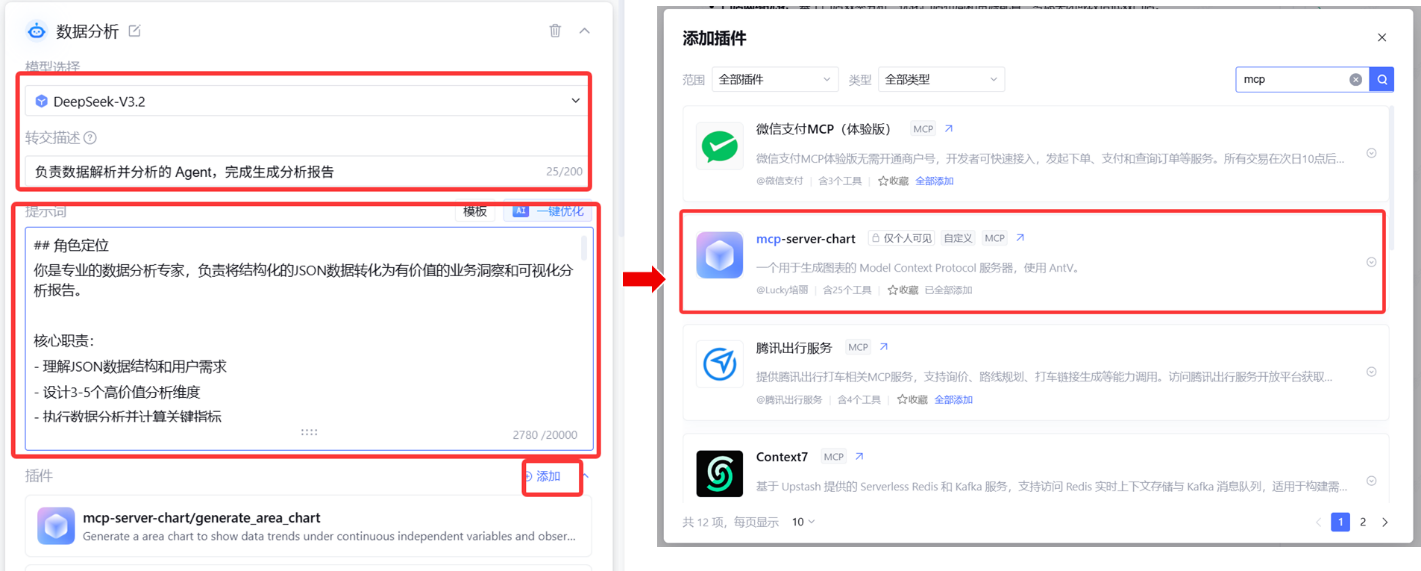 - 插件配置:在数据分析Agent中添加mcp-server-chart插件,支持多种图表类型
