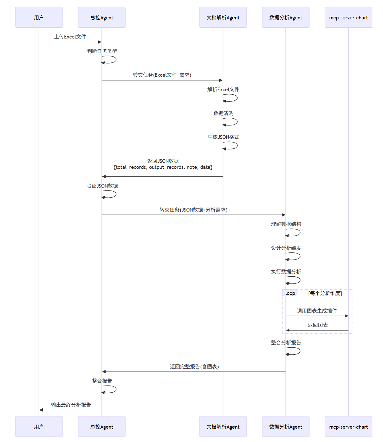 - 用户上传Excel文件 → 总控Agent接收