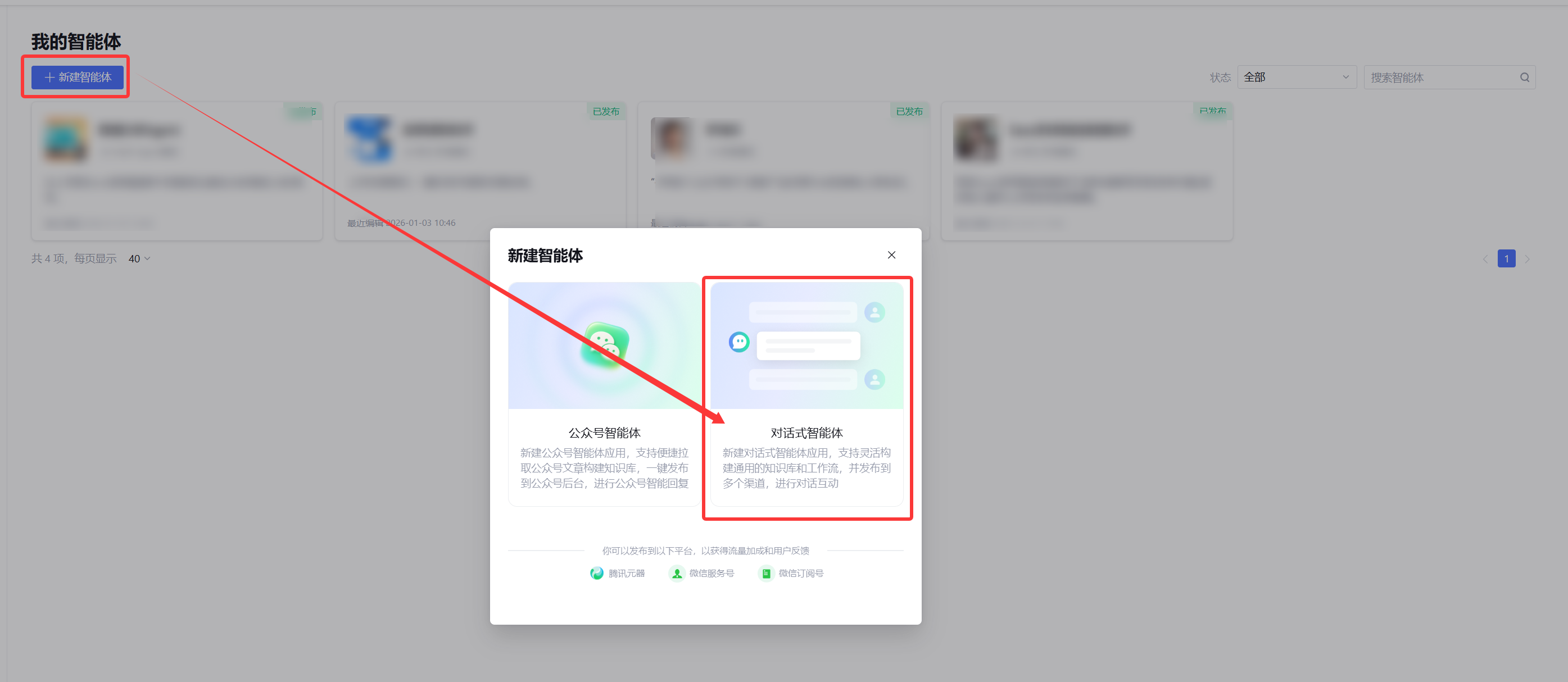 - 进入腾讯元器平台,点击"创建智能体"
